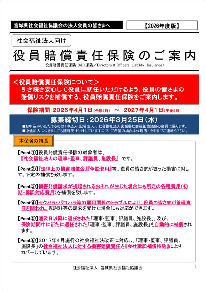 - 2017年4月施行の社会福祉法改正に対応し、「理事・監事、評議員、施設長」の社会福祉法人に対する損害賠償責任を『会社訴訟補償特約』によりカバーしています。